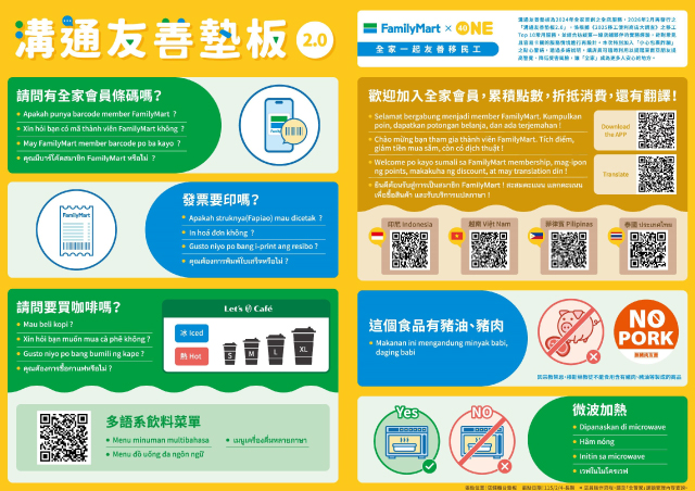 2024年,全家首創「東南亞語系溝通友善墊板」全店導入,2026年再推出「溝通友善墊板2.0」,根據《2025移工便利商店大調查》之移工Top 10常用服務,並結合訪談第一線店舖夥伴回饋,針對常見且容易卡關的服務情境進行再設計,並特別加入「包裹詐騙提醒」多語警語,協助店員可適時利用提醒東南亞朋友提高警覺、降低受害風險,讓「全家」成為更多人安心的地方。