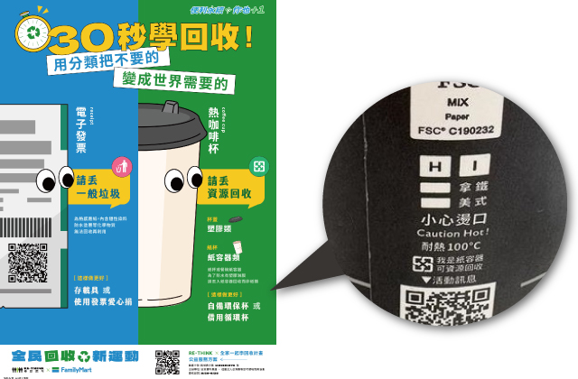 此外,全家亦透過自有的商品標示,以及店舖行銷資源,教育消費者正確的回收知識,如釋出店外海報廣宣資源,並直接於咖啡杯上印製文字,宣導紙容器可回收。