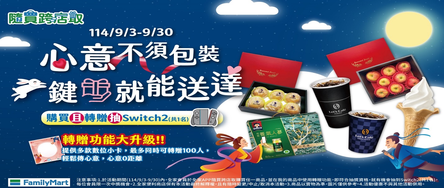 2. | 抽獎資格:於活動期間(114/9/3~114/9/30)內,全家會員於全家APP隨買跨店取購買任一商品,並在我的商品中使用轉贈功能,即符合抽獎資格,就有機會抽到Switch2(1名),每位會員限一次中獎機會。 |