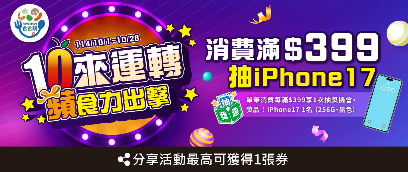 1. 本活動為全家便利商店股份有限公司(下稱主辦單位)舉辦。活動獎項公告和領取事宜,由全家便利商店股份有限公司負責。 2.抽獎資格:全家會員於活動時間內購買指定商品,單筆消費每滿399元,即可獲得1次抽獎機會,並有機會抽中IPhone17 256g 乙支 黑色 (價值約29,900元,共1名)。 3. 抽獎活動在全家總公司進行抽獎(會同律師進行抽獎見證及錄影存證,不對外開放)。中獎名單於 114/11/26 前公佈於活動網站,中獎者可至中獎公布頁面自行下載中獎通知書並須於 114/12/10 前將中獎回函掛號郵寄至『食食購10來運轉抽Iphone活動小組』收(郵戳為憑),以便核對中獎資格。若逾期寄回中獎通知信函,視同自動放棄中獎權益。回函確認中獎者資格後,主辦單位將於 114/12/19 將贈品陸續寄出。 4. 中獎獎品以實物為準,中獎者不得要求轉換商品、轉讓或折換現金。如遇產品缺貨或不可抗力之事由導致獎品內容變更,活動單位有權變更贈品,改由等值商品取代之,得獎者不得要求折現或轉換其他商品。如得獎者未於贈品兌換期限完成兌換,得獎者不得要求折現或轉換其他商品。且主辦與活動單位不負贈品之任何維護或保固責任。 5. 中獎者若未滿 20 歲,須獲得法定監護人同意及代為領取。依中華民國所得稅法規定,凡中獎價值超過新台幣$1,000 元者,獎項將須列入個人年度綜合所得稅申報 (稅額以獎品市價計算)。中獎價值超過新台幣$20,000 元者,須繳納 10%稅金(稅額以獎品市價計算),非中華民國境內居住之個人,須繳納 20%稅金(稅額以獎品市價計算)。全家便利商店依法代收中獎稅金,若中獎人未能如期依法繳納應繳稅額,即視為放棄得獎資格。 6. 如有任何因電腦、網路、電話、技術或不可歸責於主辦與活動單位之事由,而使系統誤送活動訊息或中獎通知,或使參加人所寄出或登錄之資料有遲延、遺失、錯誤、無法辨識或毀損之情況,主辦與活動單位不負任何法律責任,參加者亦不得因此異議。中獎人所填之基本資料,本公司將依法予以保護並使用於全家便利商店各項行銷活動中,並不做其他用途。 7. 本活動如有未盡事宜,全家便利商店擁有保留、修改、暫停及解釋活動內容之權利,修改訊息將於本網站上公佈,不另行通知。詳情請洽全家官網:www.family.com.tw 8. 依主辦單位隱私權保護政策與相關法令之規定,請您於填寫資料前,務必詳讀下列條款內容,若您參與本活動,即表示您同意遵守下面條款,並同意主辦單位依下列條款蒐集、處理、使用您於本網站提供之個人資料。 9. 若中獎人不符合、不同意或違反本活動規定者,主辦單位保有取消中獎資格及參與本活動的權利,並對任何破壞本活動行為保留法律追訴權。 10. 得獎人需依規定填寫並繳交相關資料,若中獎者不願意提供相關資料,則視同放棄中獎資格,不另行通知,亦不進行候補。 11. 個人資料告知聲明事項:請您在參加本活動前,詳細閱讀全家便利商店股份有限公司(以下稱本公司)為確保您個人資料及相關權益之保護,依個人資料保護法規定告知您的以下事項: A. 蒐集目的:消費者、客戶管理與服務 B. 蒐集類別:姓名、連絡電話、電子郵件 C. 個人資料利用之期間、地區、對象及方式: (1) 期間:依法令必須保存之期間或因本次特定目的所生之各業務事項運作期間。 (2) 地區:中華民國境內及本公司業務委外機構所在地。 (3) 對象:執行本活動時之必要相關人員、或依法有調查權之機關。 (4) 方式:以自動化機器或其他非自動化之利用方式。 D. 您得就您個人資料行使下列權利:查詢、閱覽或請求製給複製本;補充或更正 (惟依法您應為適當之釋明);停止蒐集、處理或利用及刪除(惟依法本公司因執行 業務所必須者,得不依您的請求為之)如您欲行使上述權利,請洽客服電話 0800-221-363 或至顧客留言板 https://cs.family.com.tw:9443/ConsumerMessage/jsp/Login.jsp,將有專人為您服務。 E. 不提供個人資料所致權益之影響:您得自由選擇是否提供相關個人資料,惟若您拒絕提供或不同意本公司蒐集、處理或利用您的相關個人資料,則將無法繼續進行本抽獎活動;若您提供之個人資料不完全或不正確時,則本公司可能無法為您提供後續抽獎活動之相關服務。
