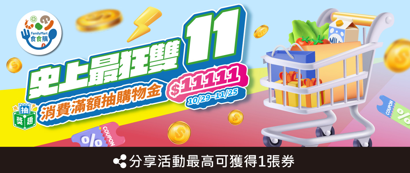 1. 本活動為全家便利商店股份有限公司(下稱主辦單位)舉辦。活動獎項公告和領取事宜,由全家便利商店股份有限公司負責。 2. 抽獎資格:全家會員於活動時間內購買指定商品,單筆消費每滿111元,即可獲得1次抽獎機會,並有機會抽中Fami錢包儲值金11,111元 (價值11,111元,共1名)。 3. 抽獎活動在全家總公司進行抽獎(會同律師進行抽獎見證及錄影存證,不對外開放)。中獎名單於 114/12/24 前公佈於活動網站,中獎者可至中獎公布頁面自行下載中獎通知書並須於 115/1/7 前將中獎回函掛號郵寄至『食食購雙11抽獎趣活動小組』收(郵戳為憑),以便核對中獎資格。若逾期寄回中獎通知信函,視同自動放棄中獎權益。回函確認中獎者資格後,主辦單位將於 115/1/23 將贈品陸續寄出。 4. 中獎獎品以實物為準,中獎者不得要求轉換商品、轉讓或折換現金。如遇產品缺貨或不可抗力之事由導致獎品內容變更,活動單位有權變更贈品,改由等值商品取代之,得獎者不得要求折現或轉換其他商品。如得獎者未於贈品兌換期限完成兌換,得獎者不得要求折現或轉換其他商品。且主辦與活動單位不負贈品之任何維護或保固責任。 5. 中獎者若未滿 20 歲,須獲得法定監護人同意及代為領取。依中華民國所得稅法規定,凡中獎價值超過新台幣$1,000 元者,獎項將須列入個人年度綜合所得稅申報 (稅額以獎品市價計算)。中獎價值超過新台幣$20,000 元者,須繳納 10%稅金(稅額以獎品市價計算),非中華民國境內居住之個人,須繳納 20%稅金(稅額以獎品市價計算)。全家便利商店依法代收中獎稅金,若中獎人未能如期依法繳納應繳稅額,即視為放棄得獎資格。 6. 如有任何因電腦、網路、電話、技術或不可歸責於主辦與活動單位之事由,而使系統誤送活動訊息或中獎通知,或使參加人所寄出或登錄之資料有遲延、遺失、錯誤、無法辨識或毀損之情況,主辦與活動單位不負任何法律責任,參加者亦不得因此異議。中獎人所填之基本資料,本公司將依法予以保護並使用於全家便利商店各項行銷活動中,並不做其他用途。 7. 本活動如有未盡事宜,全家便利商店擁有保留、修改、暫停及解釋活動內容之權利,修改訊息將於本網站上公佈,不另行通知。詳情請洽全家官網:www.family.com.tw 8. 依主辦單位隱私權保護政策與相關法令之規定,請您於填寫資料前,務必詳讀下列條款內容,若您參與本活動,即表示您同意遵守下面條款,並同意主辦單位依下列條款蒐集、處理、使用您於本網站提供之個人資料。 9. 若中獎人不符合、不同意或違反本活動規定者,主辦單位保有取消中獎資格及參與本活動的權利,並對任何破壞本活動行為保留法律追訴權。 10. 得獎人需依規定填寫並繳交相關資料,若中獎者不願意提供相關資料,則視同放棄中獎資格,不另行通知,亦不進行候補。 11. 個人資料告知聲明事項:請您在參加本活動前,詳細閱讀全家便利商店股份有限公司(以下稱本公司)為確保您個人資料及相關權益之保護,依個人資料保護法規定告知您的以下事項: A. 蒐集目的:消費者、客戶管理與服務 B. 蒐集類別:姓名、連絡電話、電子郵件 C. 個人資料利用之期間、地區、對象及方式: (1) 期間:依法令必須保存之期間或因本次特定目的所生之各業務事項運作期間。 (2) 地區:中華民國境內及本公司業務委外機構所在地。 (3) 對象:執行本活動時之必要相關人員、或依法有調查權之機關。 (4) 方式:以自動化機器或其他非自動化之利用方式。 D. 您得就您個人資料行使下列權利:查詢、閱覽或請求製給複製本;補充或更正 (惟依法您應為適當之釋明);停止蒐集、處理或利用及刪除(惟依法本公司因執行 業務所必須者,得不依您的請求為之)如您欲行使上述權利,請洽客服電話 0800-221-363 或至顧客留言板 https://cs.family.com.tw:9443/ConsumerMessage/jsp/Login.jsp,將有專人為您服務。 E. 不提供個人資料所致權益之影響:您得自由選擇是否提供相關個人資料,惟若您拒絕提供或不同意本公司蒐集、處理或利用您的相關個人資料,則將無法繼續進行本抽獎活動;若您提供之個人資料不完全或不正確時,則本公司可能無法為您提供後續抽獎活動之相關服務。