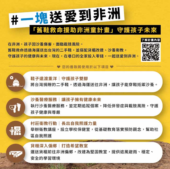 「舊鞋救命協會」自2014年起致力於募集狀況良好的二手鞋送到非洲,至今已募得超過三百萬雙鞋子,讓孩子有機會穿上保護雙腳的鞋子,再輔以衛生教育,改善當地的健康環境,幫助至少三百萬孩子與居民獲得健康的生活。